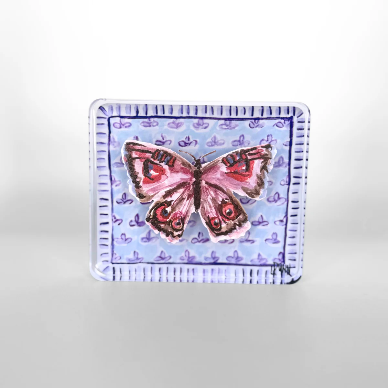 Our purple butterfly on fleur de lis acrylic block features Lauren's artwork printed on both the front and back surfaces of the acrylic, creating a layered look that gives the butterfly a subtle floating effect. The colorful, pattern-filled design has a lively, modern feel, and the layered printing adds depth and dimension when viewed from different angles. It’s a striking piece with a joyful presence — a reminder of growth, renewal, and the beauty found in life’s unfolding moments.