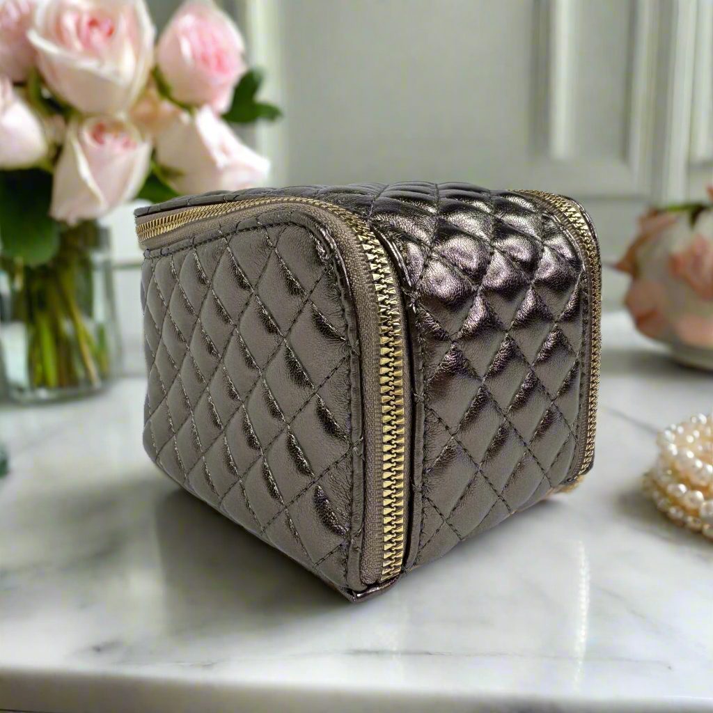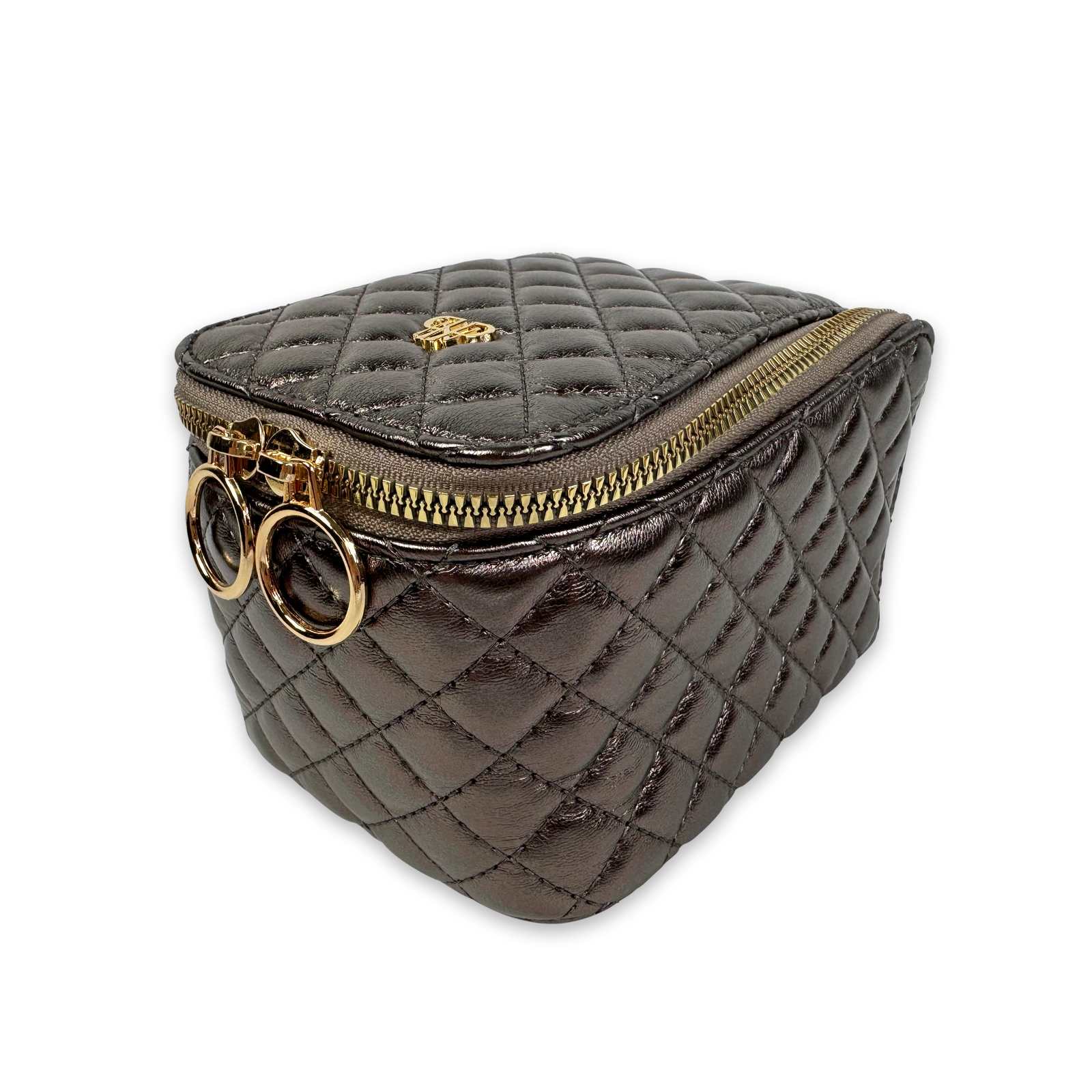 Chic, compact, and cleverly designed, the Train Jewelry Case in metallic Bronze is your go-to for maximum organization in a perfectly portable size. Ideal for small to medium jewelry pieces, it unzips to completely reveal a thoughtfully arranged interior featuring 2 elastic pockets, 3 clear front zippered compartments, and space for everything from studs to statement pieces. With 3 earring stays, 3 necklace holders, and 6 removable clear front pouches included, this soft-sided case brings effortless elegance to your travel routine - and keeps your sparkle sorted and easy to see wherever you go.