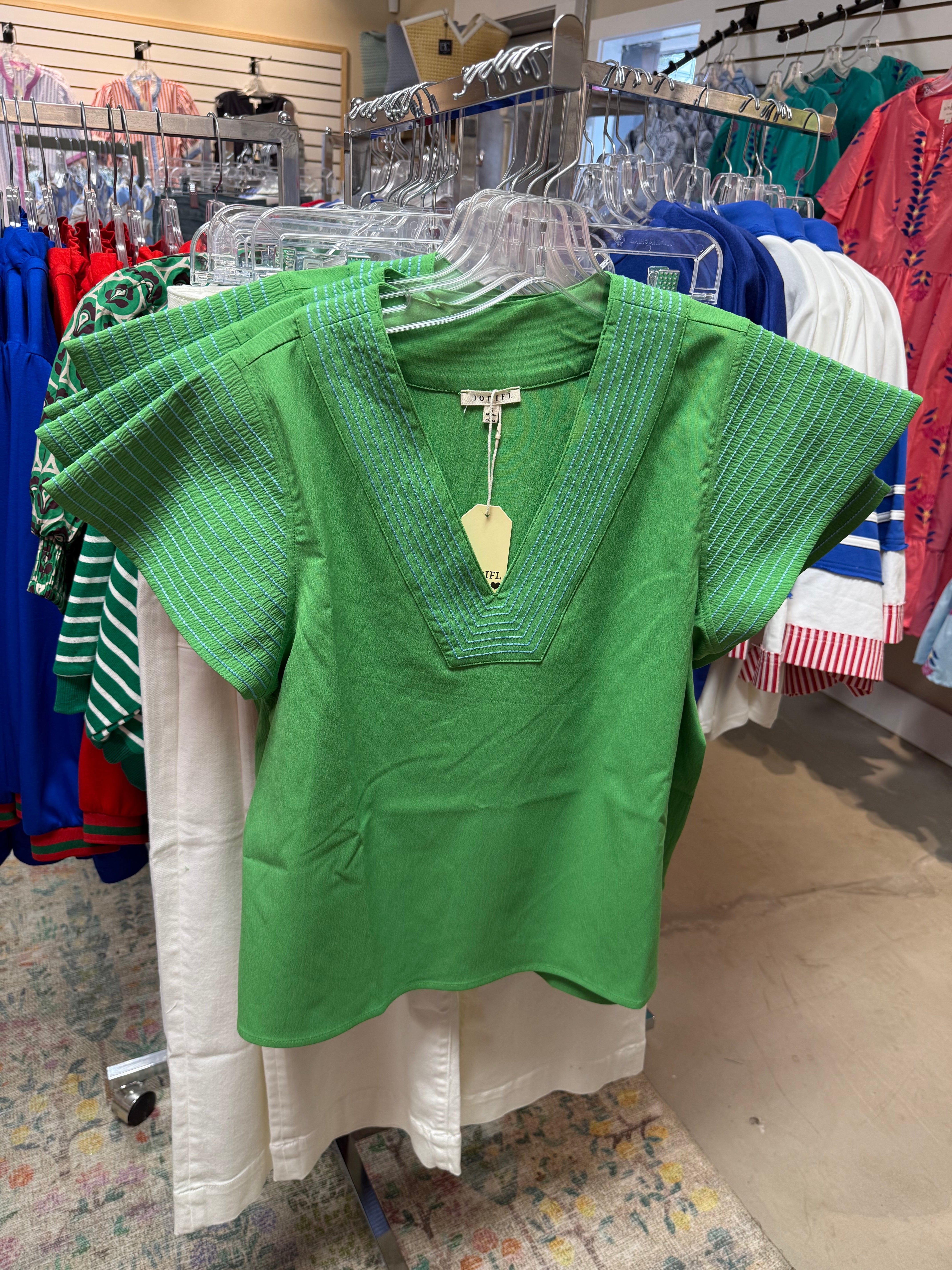 Bright, bold, and effortlessly flattering, this V-neck top brings a fresh pop of color to your everyday wardrobe. Designed with a relaxed, easy fit, this top features beautifully stitched detailing along the neckline and sleeves, adding texture and dimension that elevates a simple silhouette.