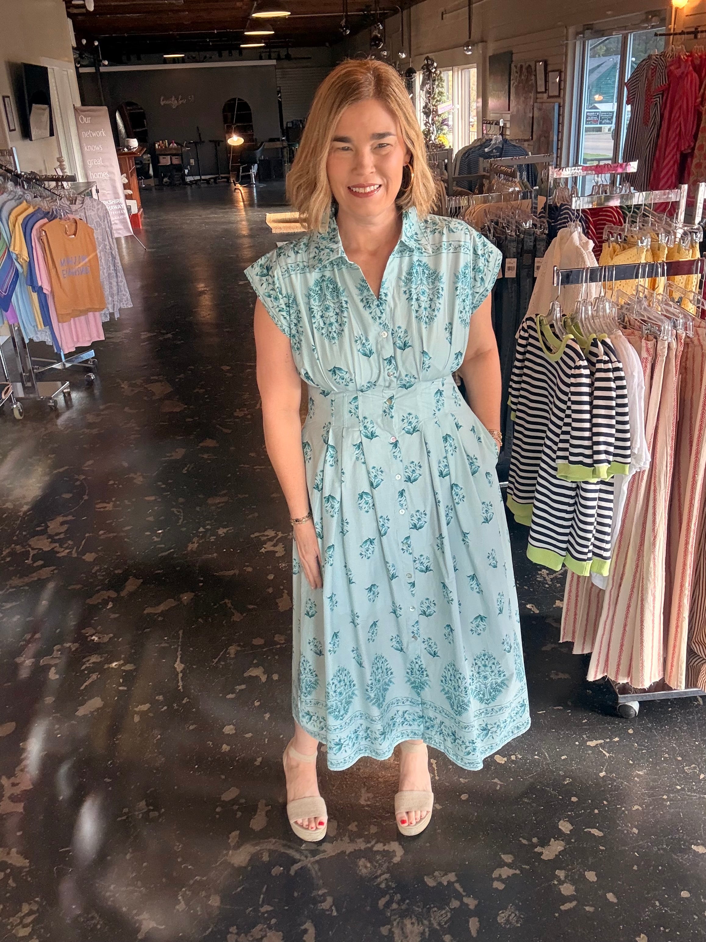 Lightweight, breathable, and easy to style, the Bluebell Garden Shirt Dress is one of those pieces you’ll reach for again and again.