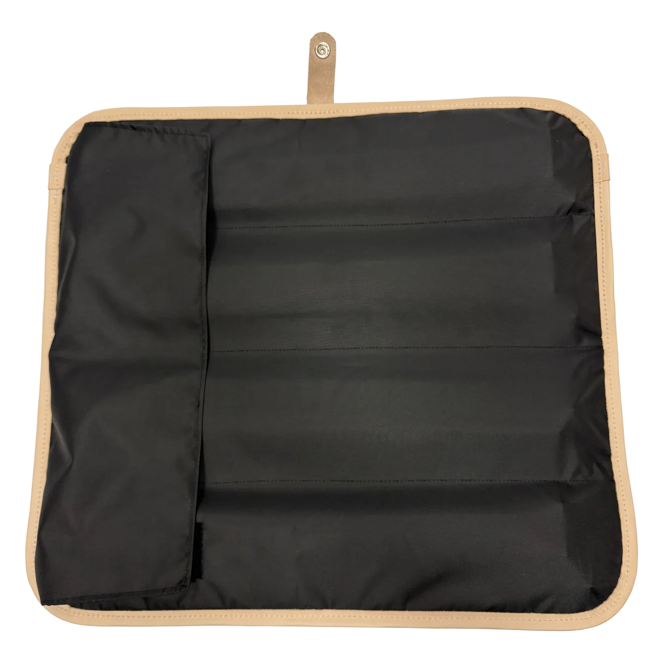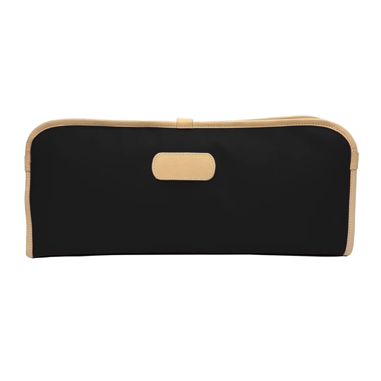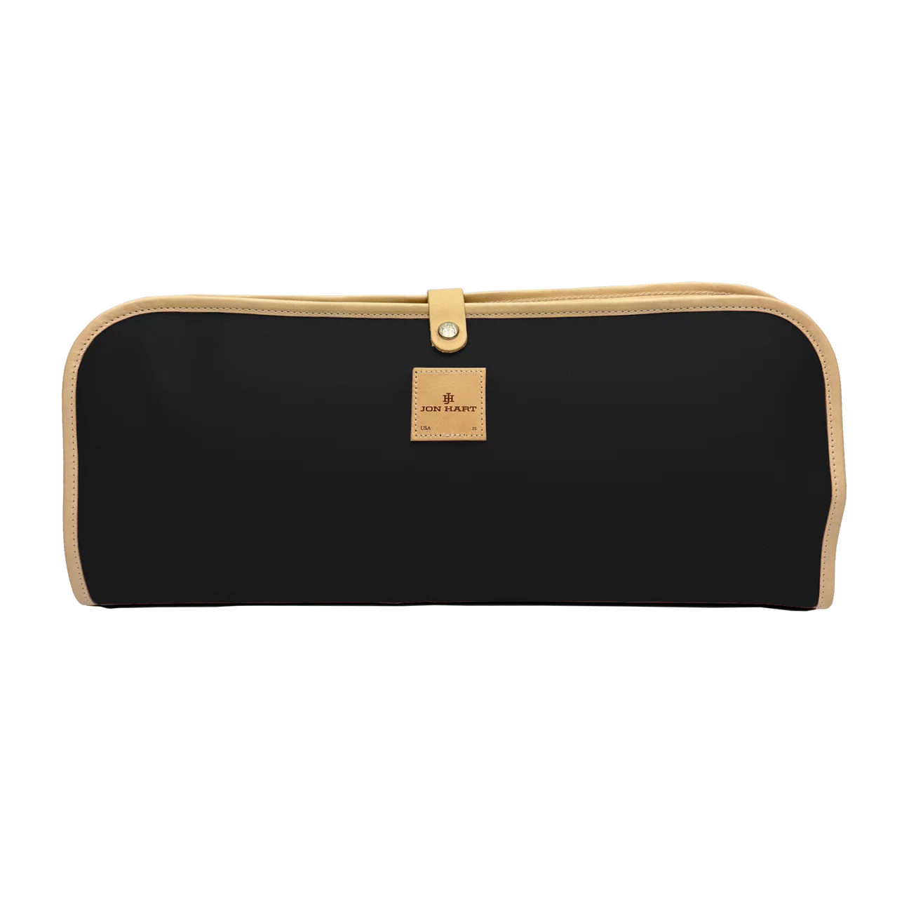 Product DetailsCoated canvas with natural leather trim. Outside snap closure. Black lining pockets with Velcro closure.