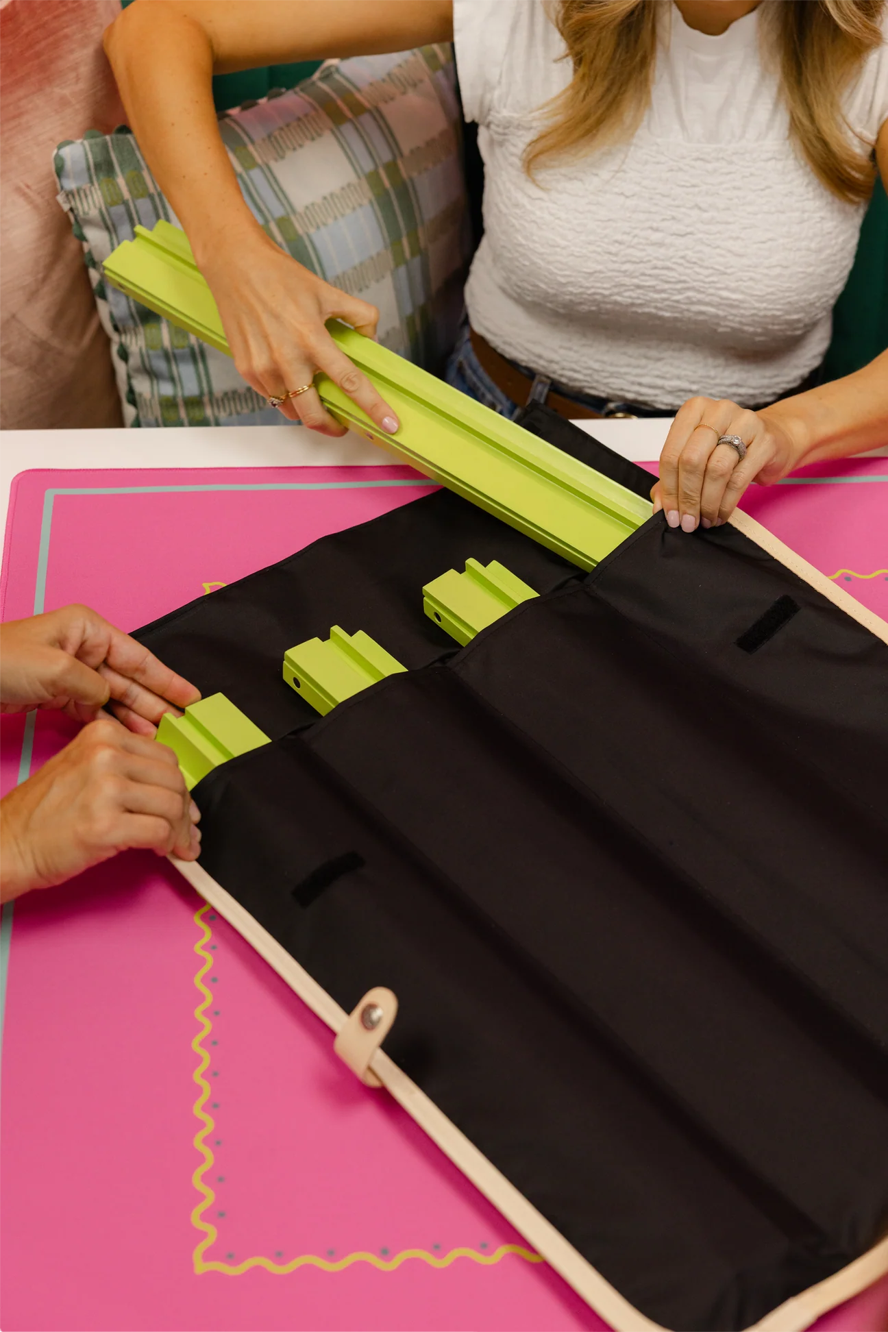 The Charleston was designed with Mahjong players in mind. This clever case neatly holds up to four racks (up to 20") inside secure slots, with an interior flap to keep them in place. It folds closed with an easy snap closure, making it simple to carry and store.