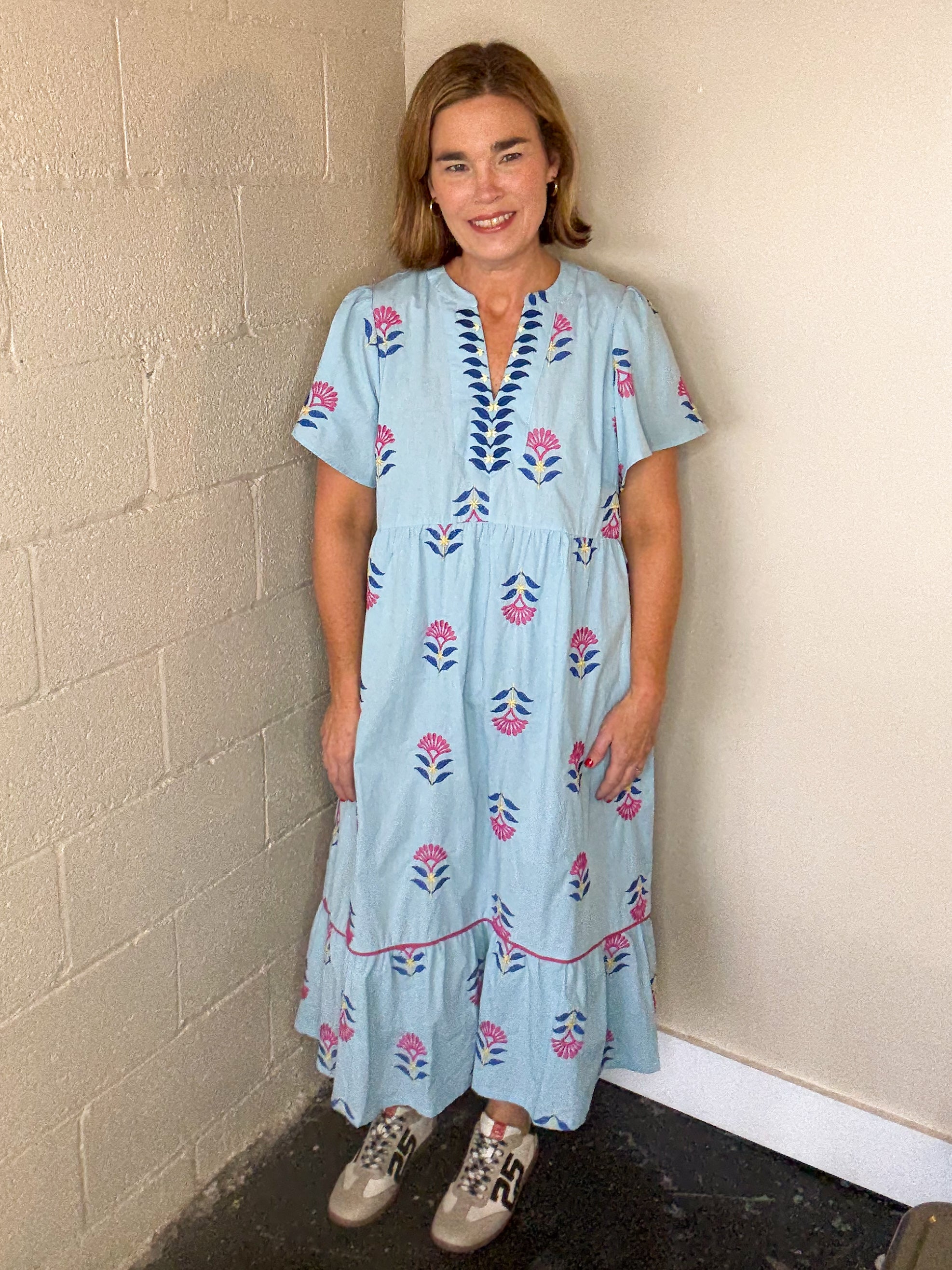 Soft, graceful, and effortlessly charming — this periwinkle blue midi dress is a true feel-good favorite. Designed with delicate floral embroidery throughout, it features a flattering split neckline with embroidered detailing and short sleeves for an easy, breezy fit. The relaxed, tiered silhouette flows beautifully while still feeling polished and feminine.
