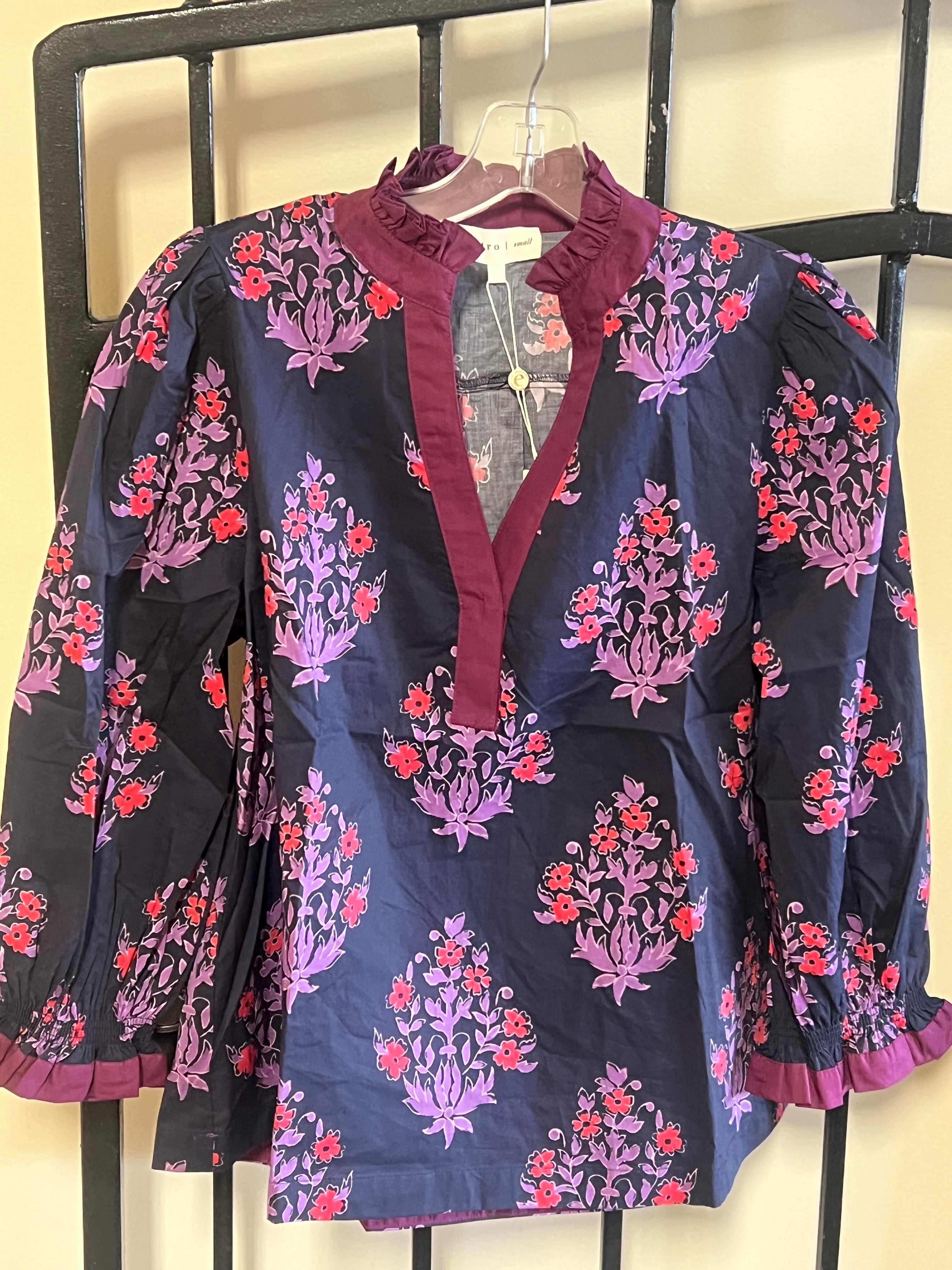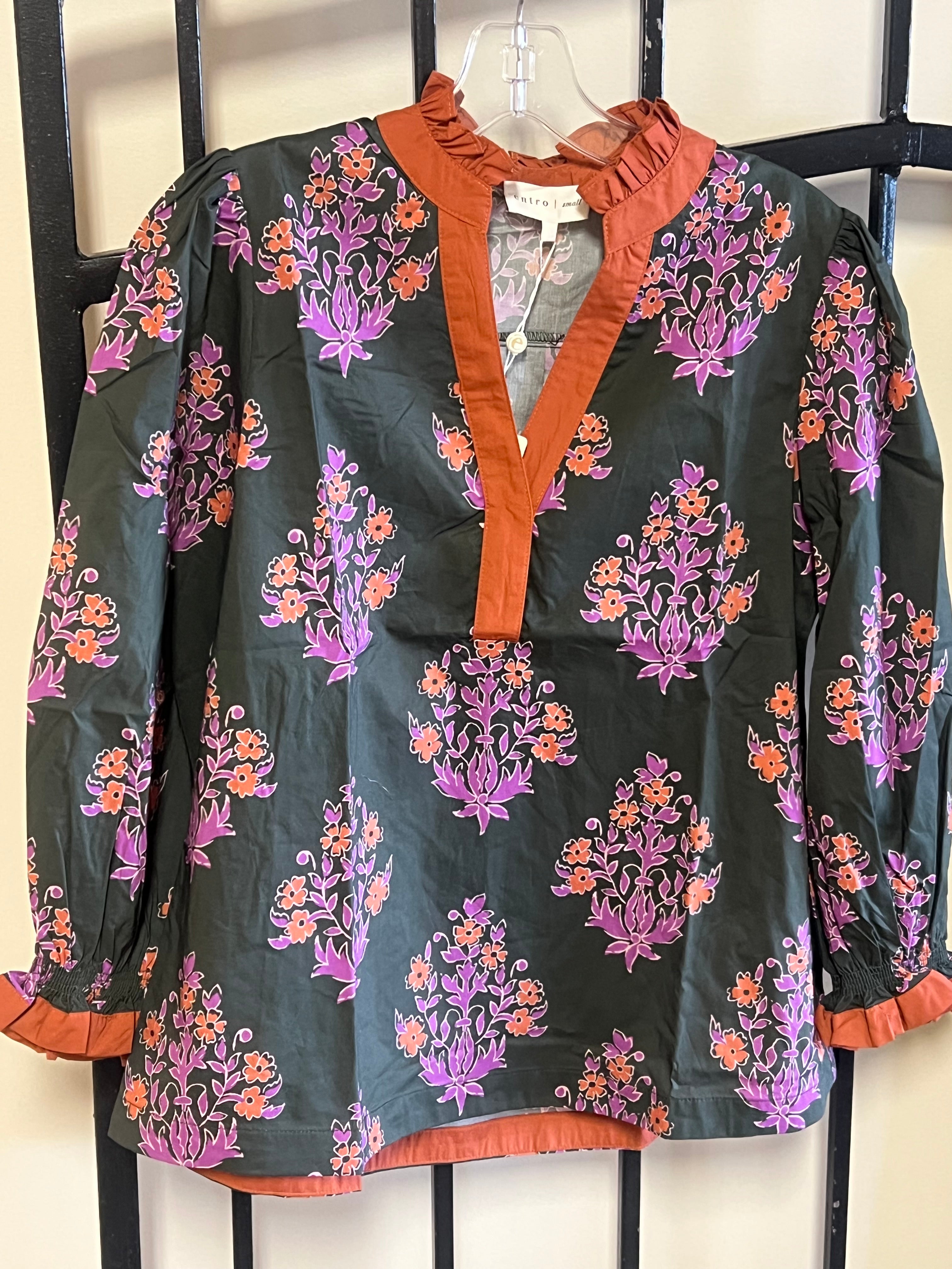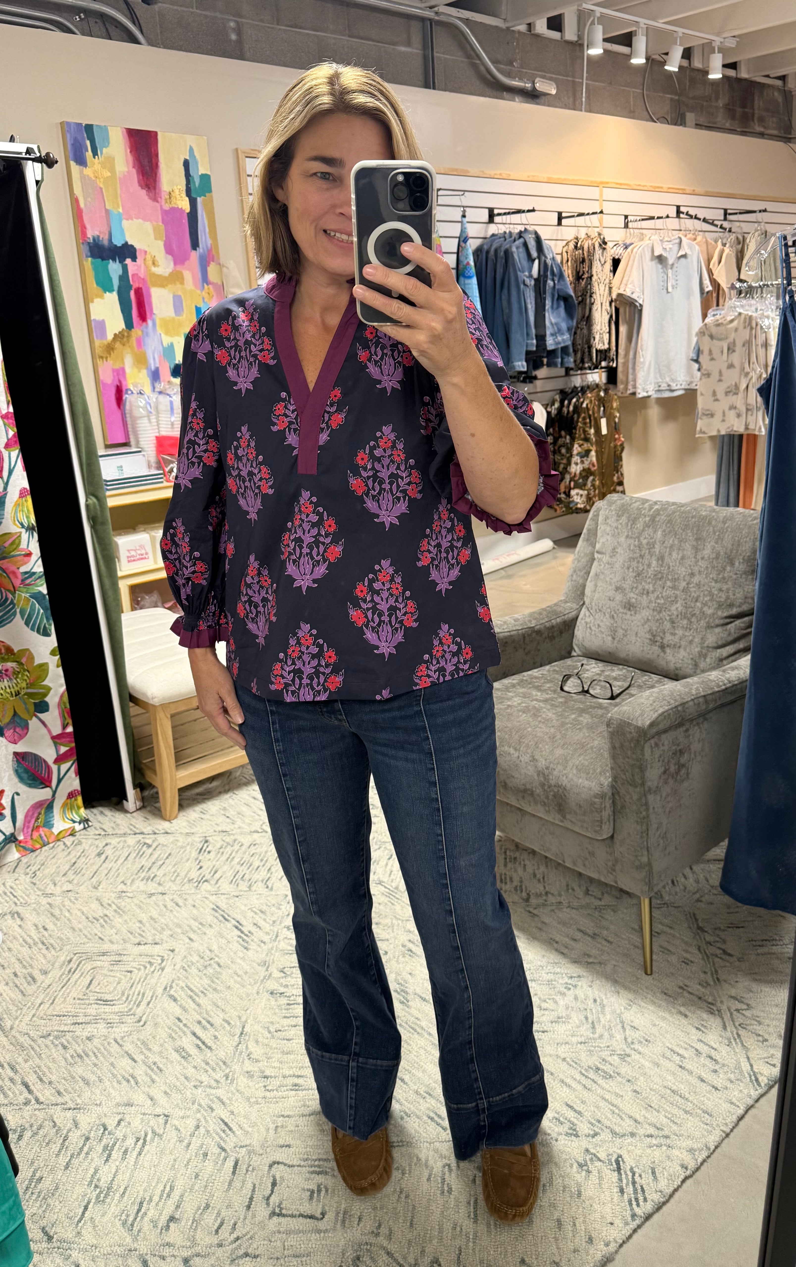 Available in two gorgeous colorways — Navy with Berry Trim and Olive with Rust Trim — this blouse pairs beautifully with your favorite denim, trousers, or a sleek skirt for a chic, feminine finish.