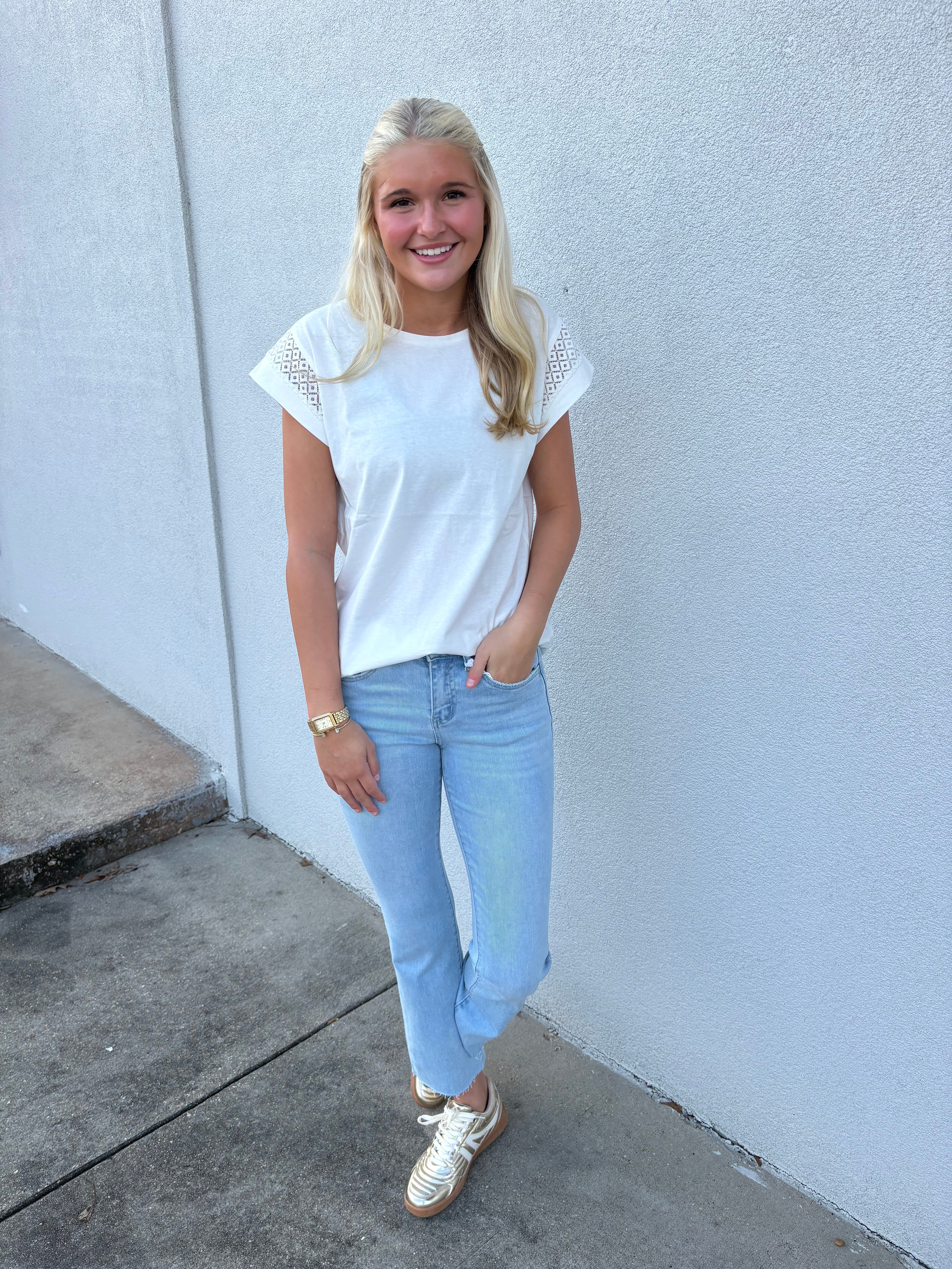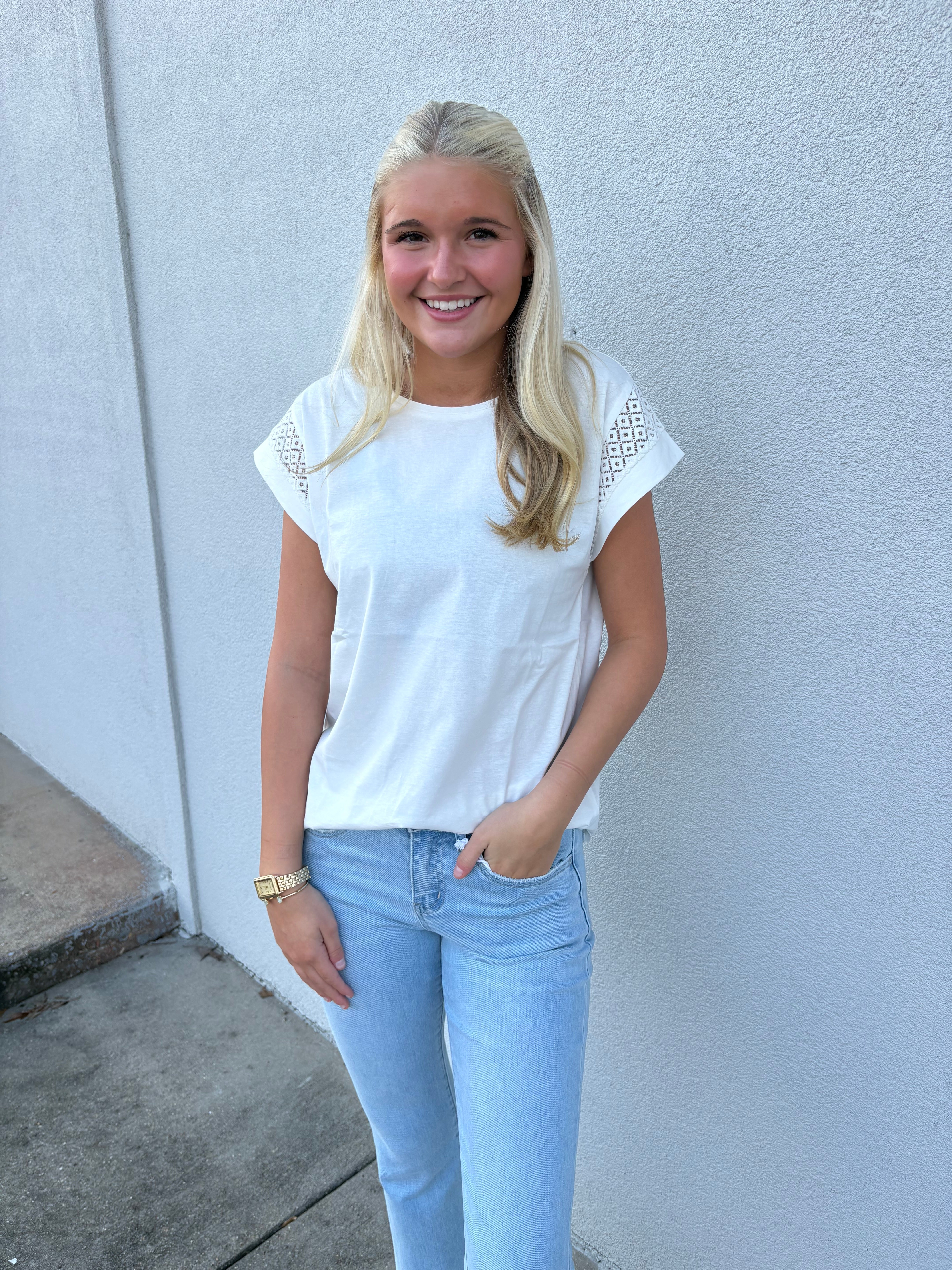 This white short sleeve top is the perfect blend of simplicity and sweet detail. Featuring a classic round neckline and a relaxed, flattering fit, it’s designed for effortless everyday wear. The delicate lace inset along the shoulders adds a feminine touch and subtle texture, elevating this timeless basic just enough to make it special.