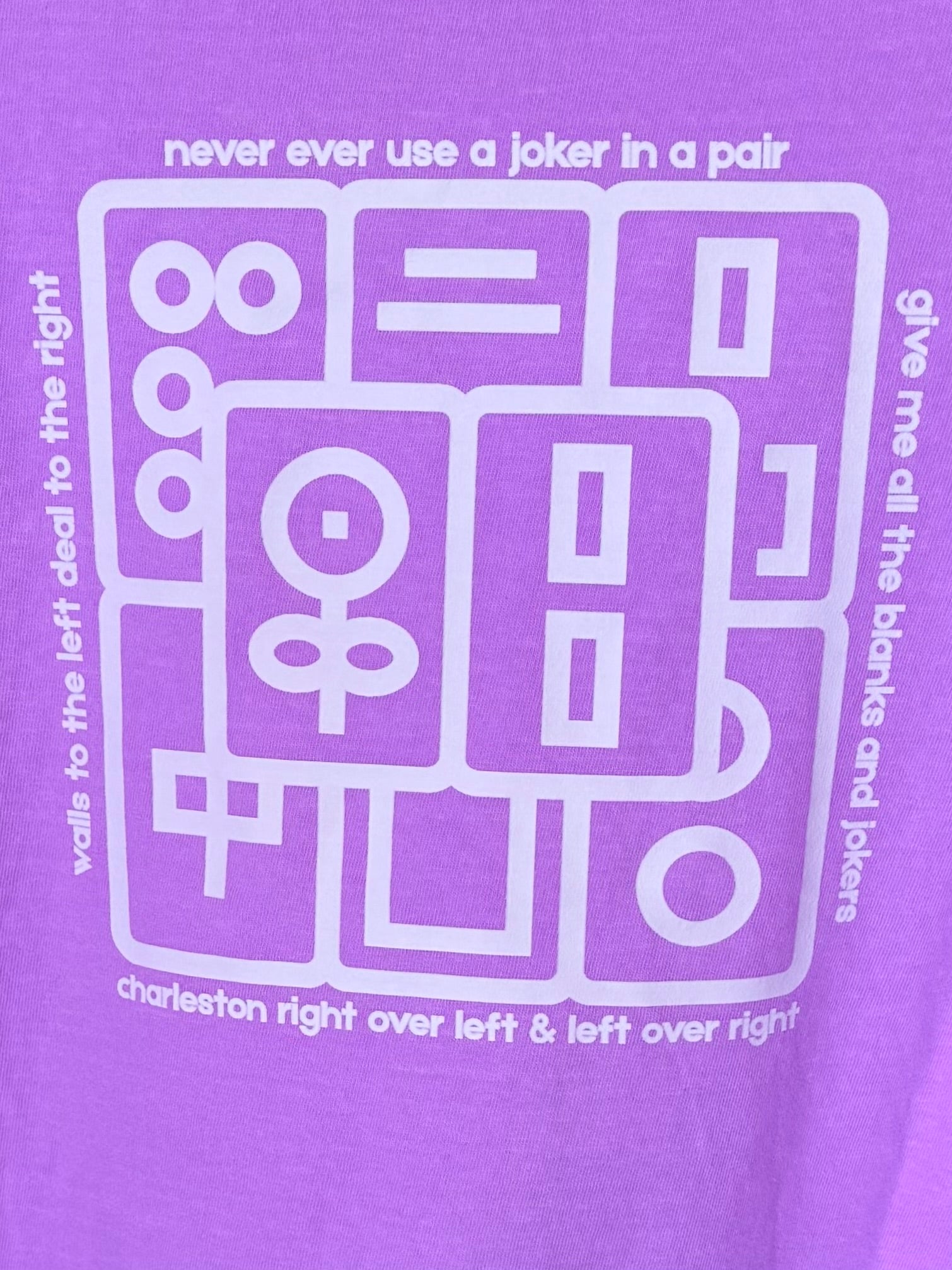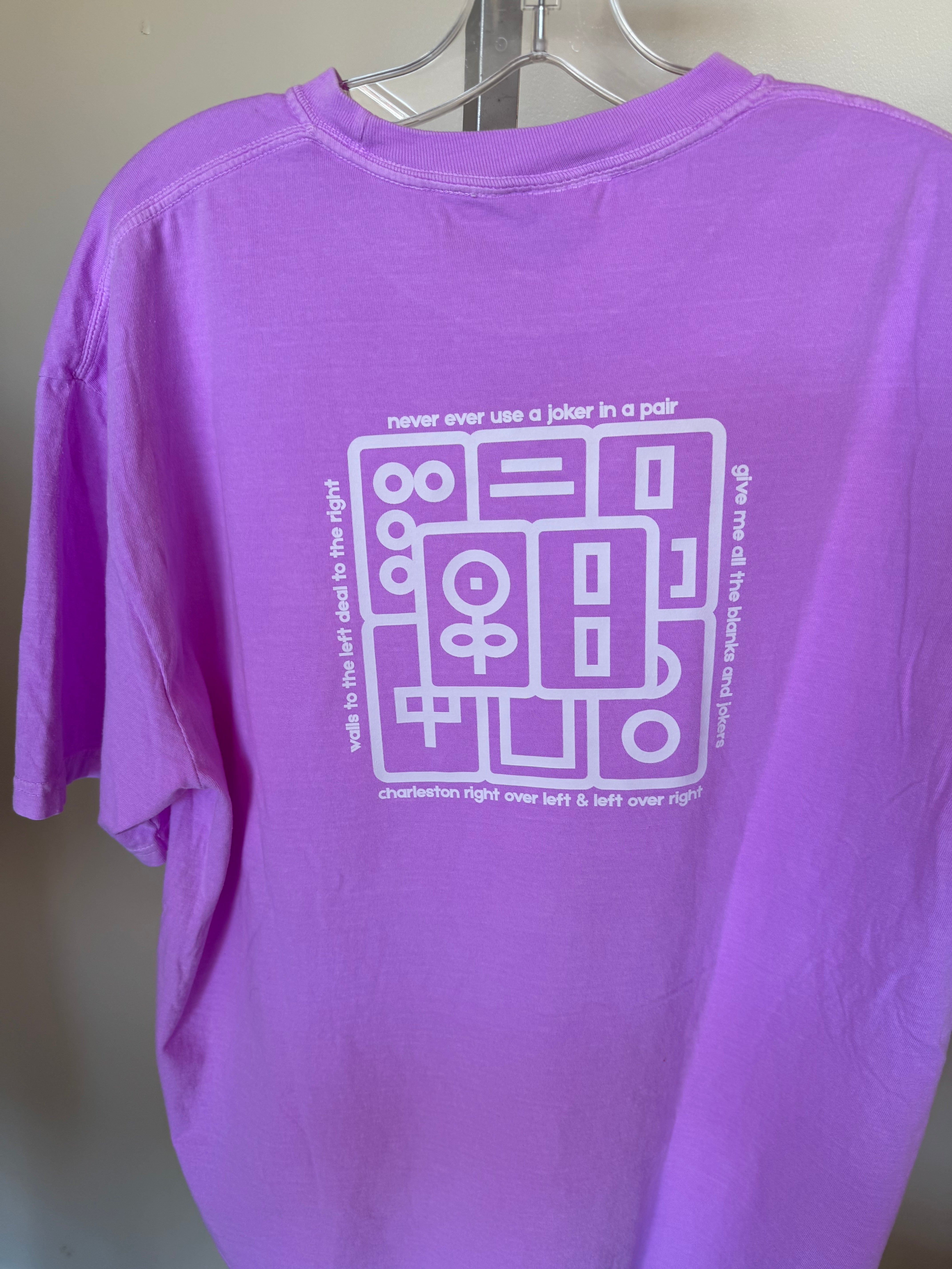 This vibrant lilac Comfort Colors t-shirt is the perfect mix of playful and classic. The front features a clean, modern “mahj” graphic in crisp white, while the back makes a bold statement with a fun Mahjong-inspired design and cheeky sayings every tile lover will appreciate — from “never ever use a joker in a pair” to “give me all the blanks and jokers.” It’s the ultimate conversation starter for league nights, tournaments, or casual coffee runs with your Mahjong crew.