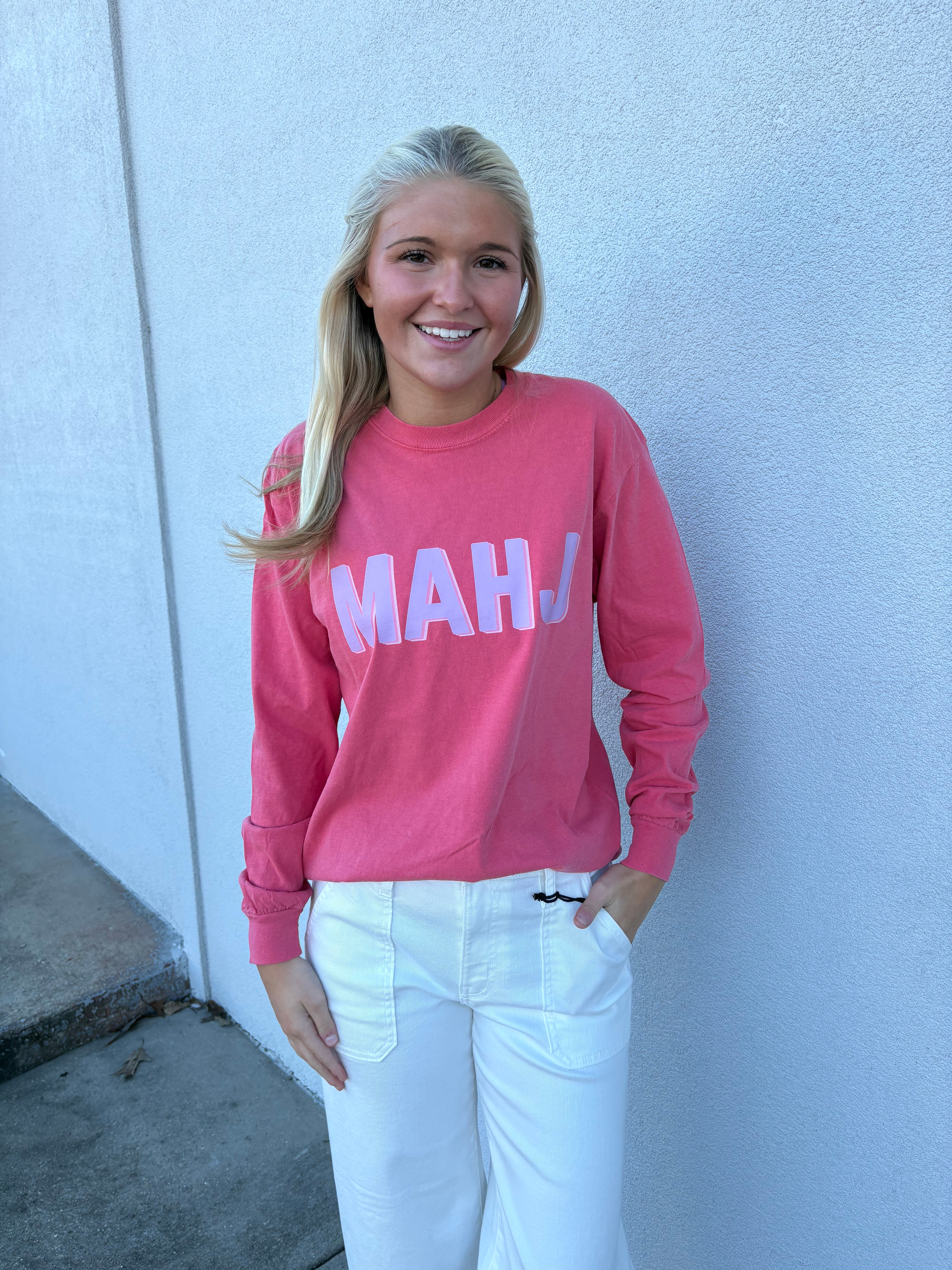 MAHJ tee, comfort colors in longsleeve or shortsleeve watermelon color. S-XXL