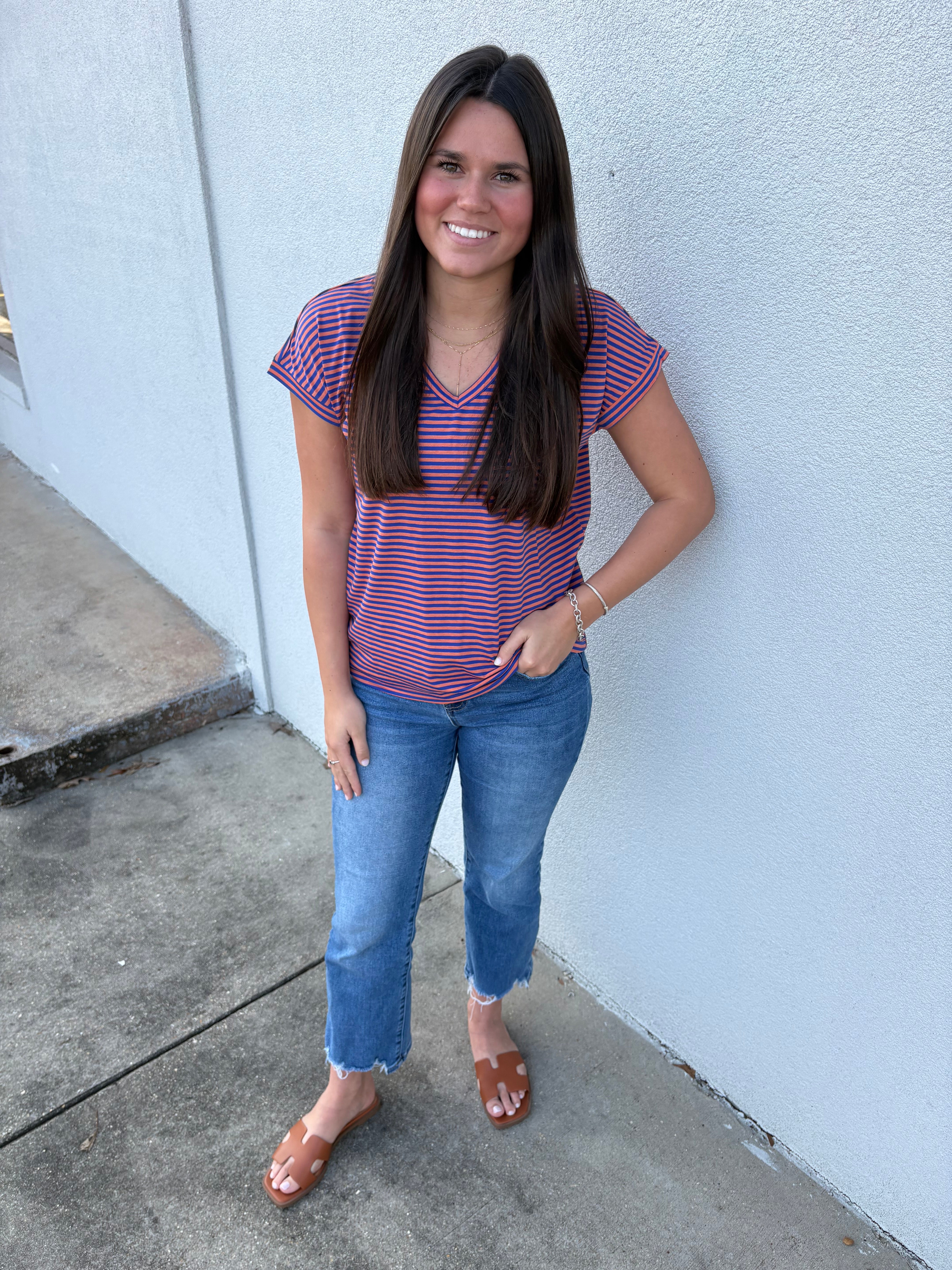 Orange/Royal V-Neck Striped Top