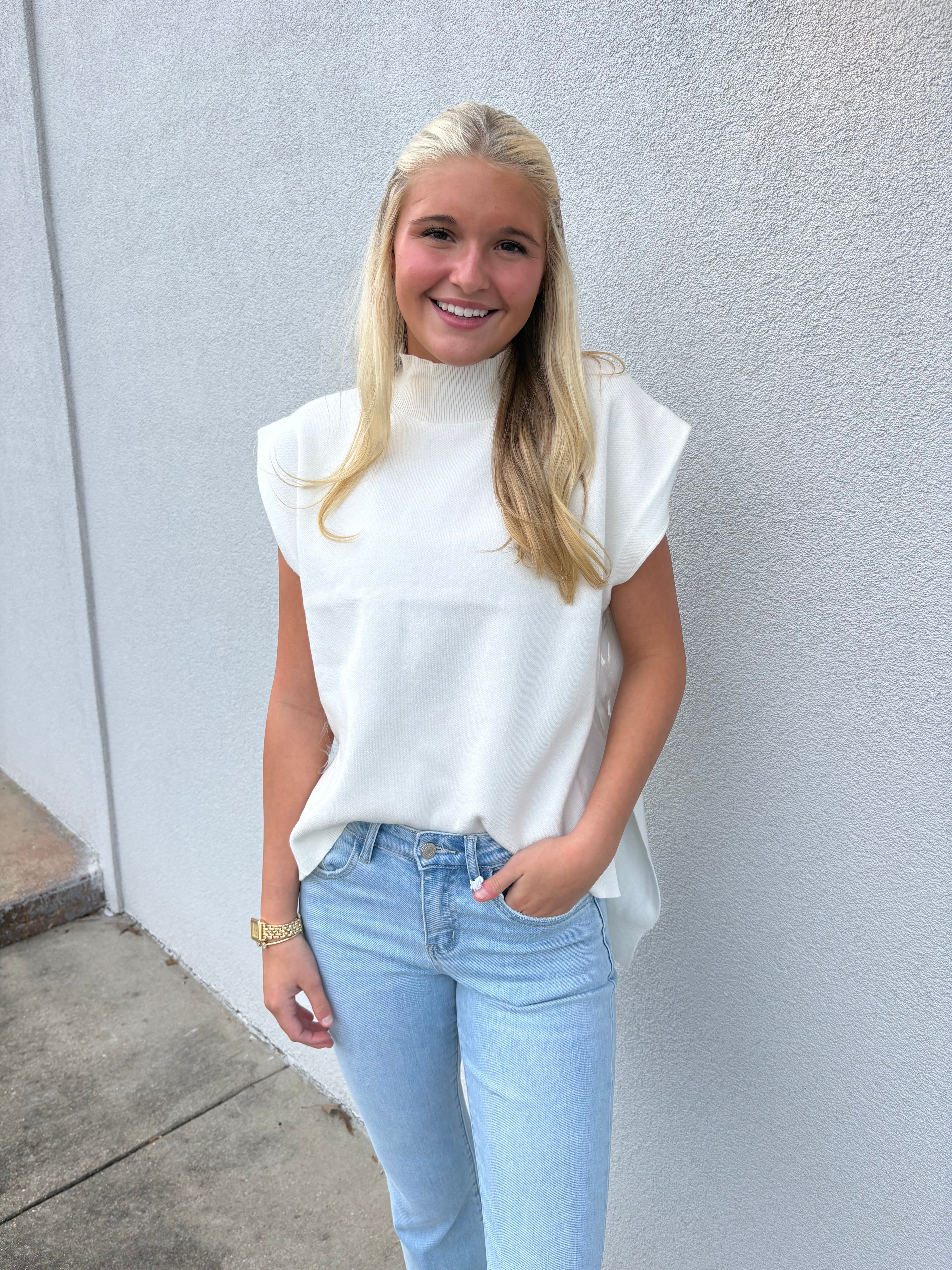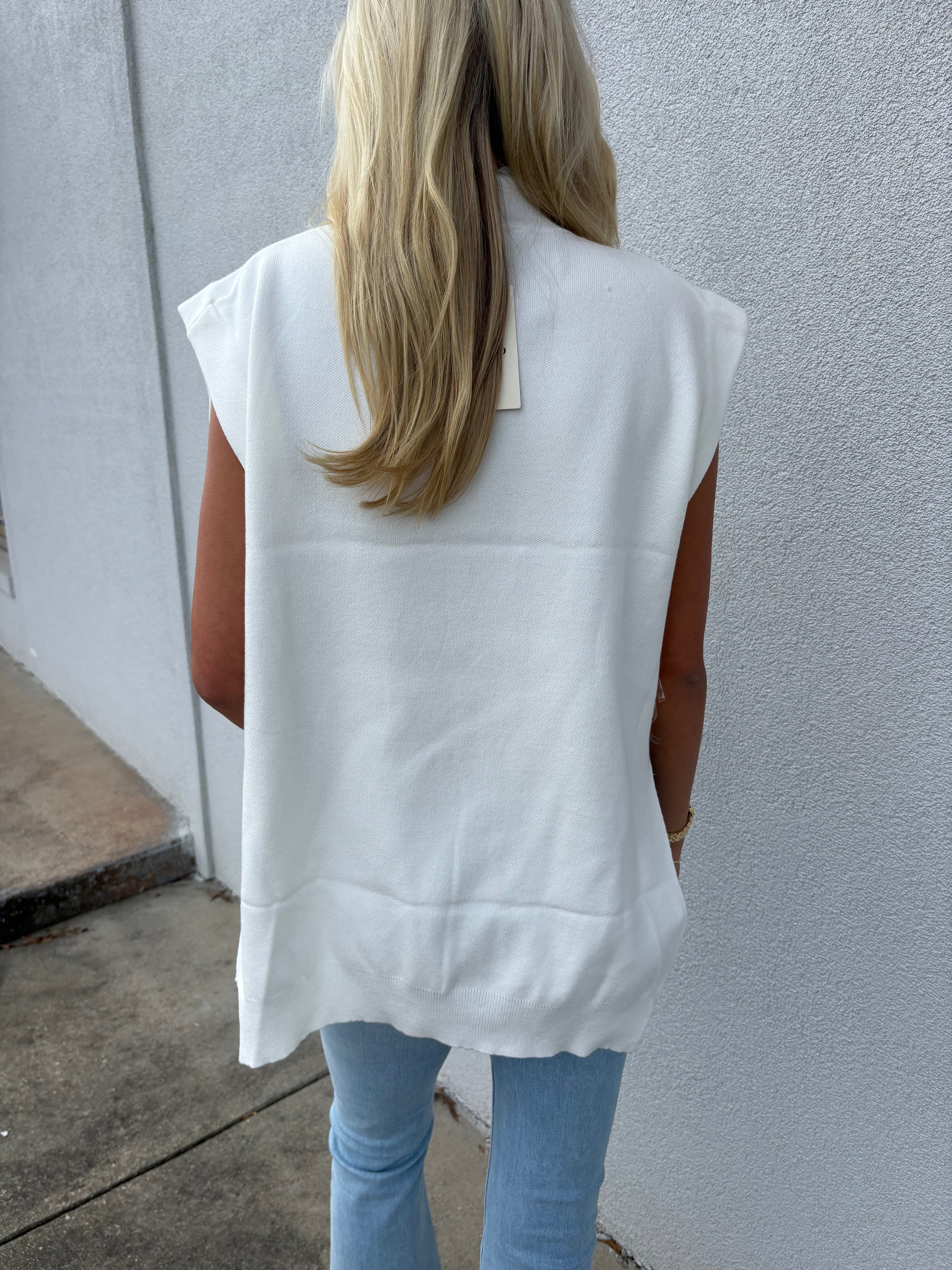 The slightly longer back hem and subtle side slits create a flattering silhouette that moves with you, while the sleeveless design keeps the look fresh and modern. Style it over a crisp button-down, a simple tee, or wear it on its own with denim or tailored trousers for a polished boutique-ready outfit.