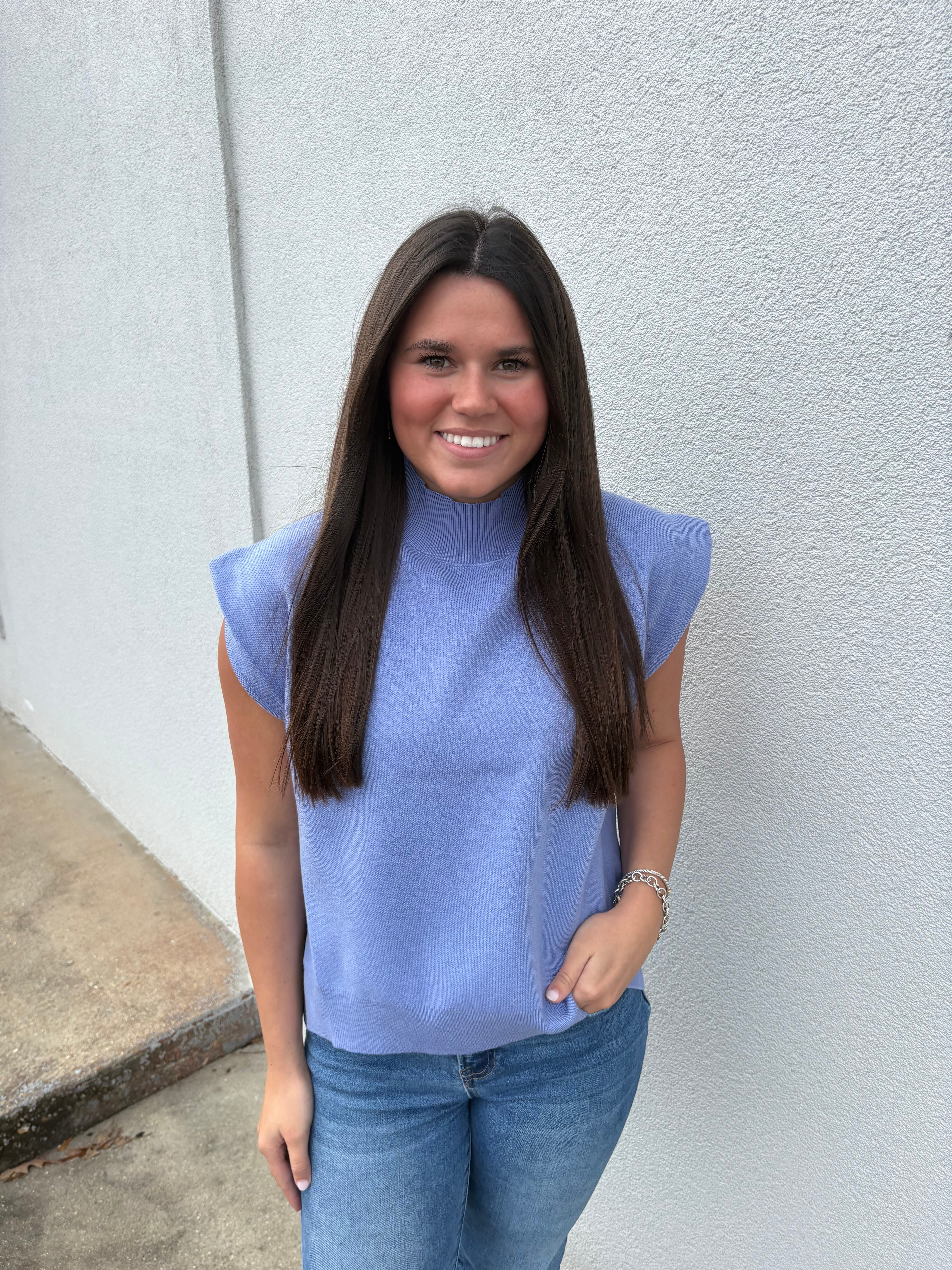 Clean, chic, and beautifully versatile, this modern sweater vest is a must-have for effortless everyday style. Available in a dreamy soft blue and a timeless off-white, this piece features a sleek mock neckline and a relaxed, easy fit that drapes just right. The silky-smooth knit feels lightweight yet cozy, making it perfect for layering or wearing solo as the seasons change.