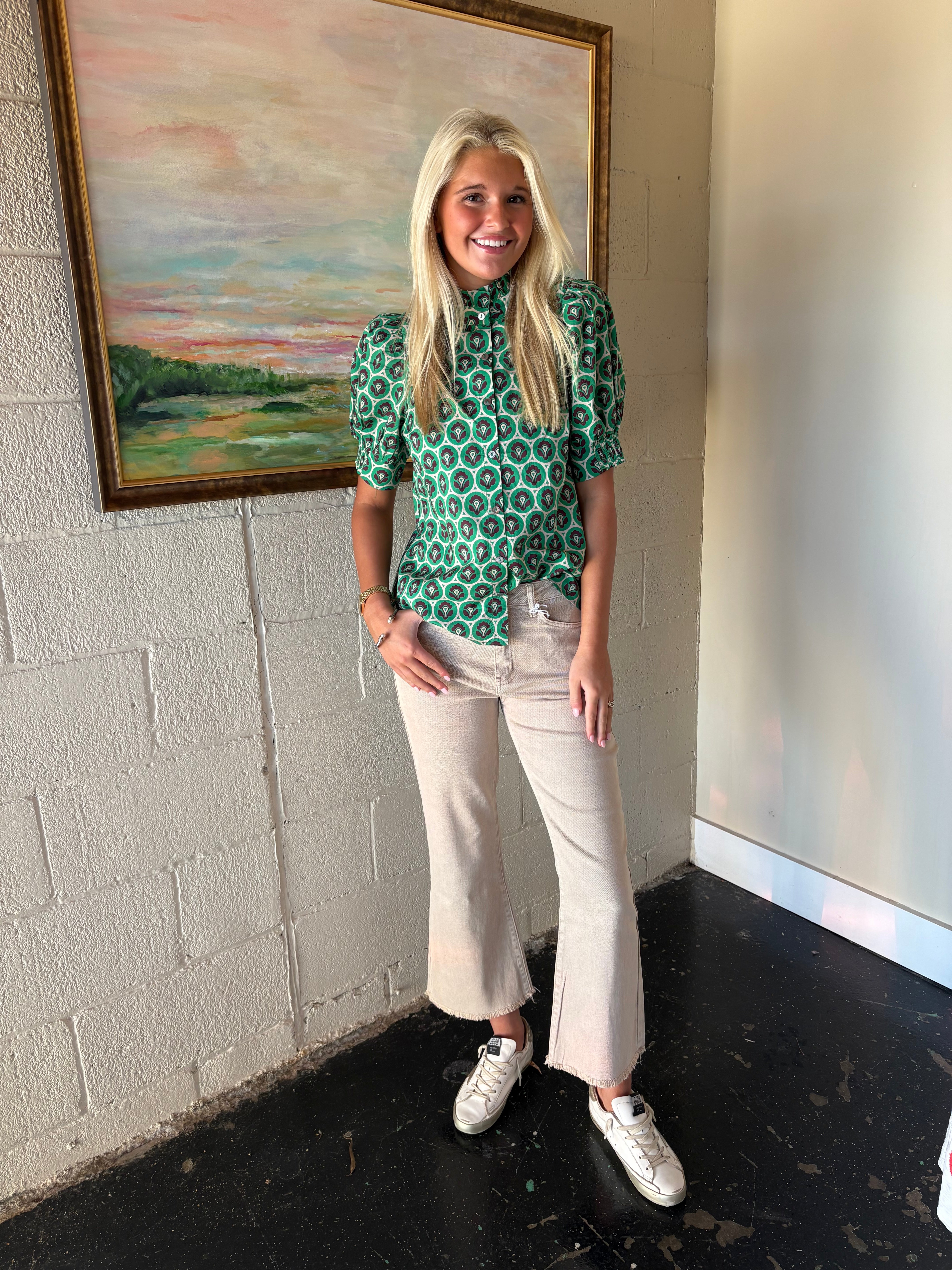 Bold, beautiful, and bursting with personality, this eye-catching green print top is made to turn heads. Featuring a rich emerald backdrop with a chic geometric-inspired motif, it delivers a playful yet polished look that feels both modern and timeless. The softly gathered puff sleeves add just the right touch of feminine flair, while the classic button-front design keeps it effortlessly wearable.