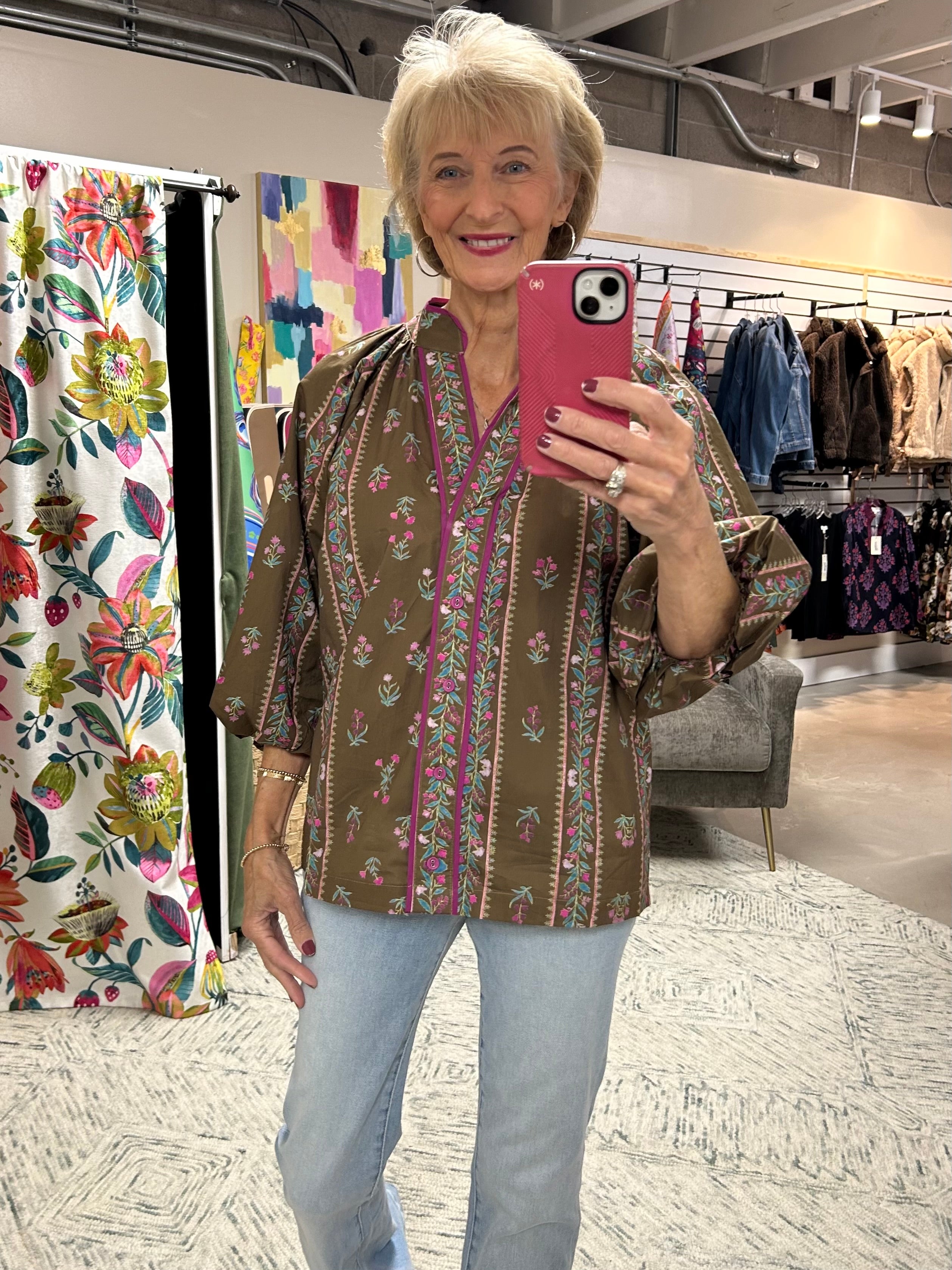 Bring a touch of timeless charm to your fall wardrobe with our Autumn Garden Top. This rich mocha top features beautifully detailed vertical floral embroidery in shades of pink, plum, and sage — creating a flattering, lengthening effect. The split neckline with a contrast trim and voluminous ¾ balloon sleeves add a feminine, boho-inspired touch that’s effortlessly chic.
