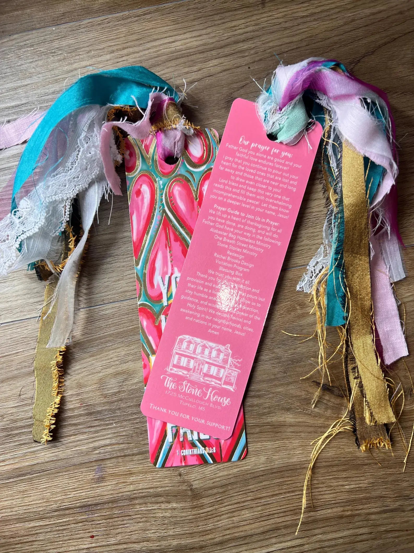 The Bible Bookmarks are a fundraiser that is near to my heart. For each bookmark sold, 40% of the proceeds go back to a local Tupelo, Mississippi ministry, The Stone House. This ministry serves as so many things to our community. It is a gathering place for believers, an equipping resource for Christian literature and bible study groups, a nurturing facility for faith based therapy and counseling, as well as a hub for serving through street/trafficking ministry, and homeless ministry. Purchasing these bookmarks helps keep the doors of The Stone House open to those who need it, as well as helping to provide resources for those who utilize it. Maybe for a woman off the street that needs a hot shower, or a meal for one of our local food insecure. We are so grateful for your support through your purchase of the bookmarks. • 160 lb Stock - Laminated - Corner Rounded • Extravagant tassels unique to each bookmark • Gold Foil Stamp Accents • Size: 2.25" x 7.5" • Art By Rachel Brooks